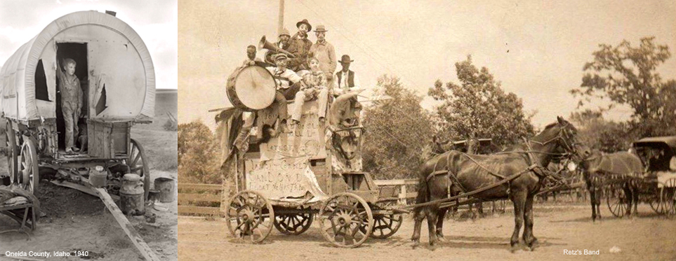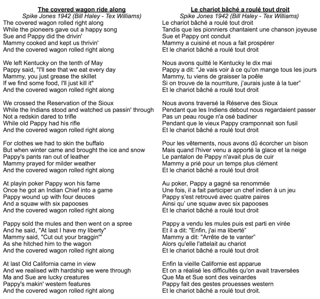 L’inconscient collectif, irrigué par la geste romantique de la poussée vers l’Ouest au XXème siècle, se construit d’abord par le biais de romans, puis par le Western et ses avatars discographiques. Le chariot bâché en convois y devient dès les années 30 une figure stéréotypée qui fut déclinée jusqu’aux années 60. Alors, les remises en question des mythes de l’Ouest, en particulier la spoliation des terres amérindiennes et les crimes associés à cette expansion, mis en récit par le Western lui-même, firent tomber la figure en désuétude. La nostalgie permet cependant de conserver une tendresse pour les buggies, calèches et autres transports attelés. Deux exemples des années 40 et 50 illustrent cette permanence naïve et univoque où tous les stéréotypes sont convoqués. Spike Jones n’est pas spécifiquement connu comme artiste Country, pourtant, ce gagman de génie, officia souvent avec son Big Band avec les pointures du Western Swing californien, en particulier le steel-guitariste de légende Speedy West. La chanson fut reprise par Tex Williams et Bill Haley.