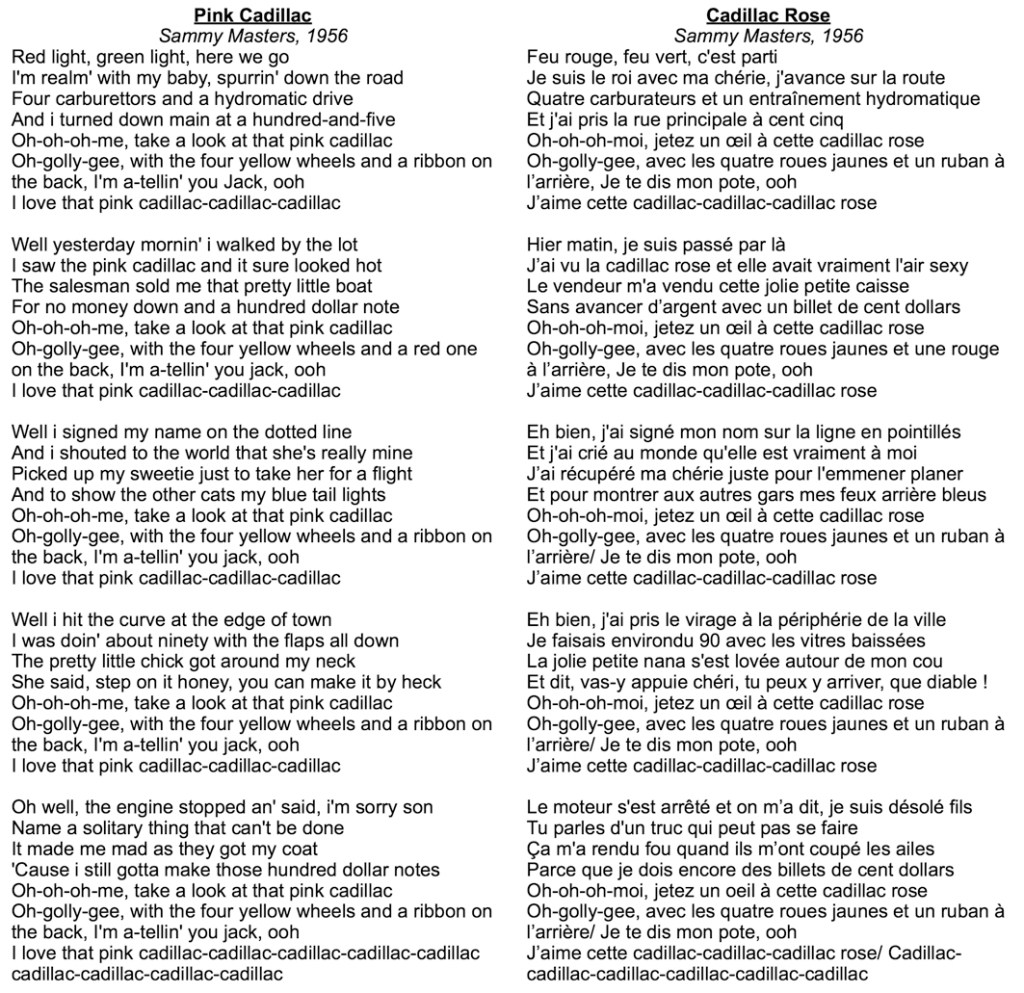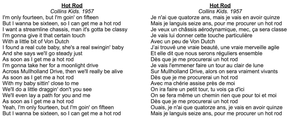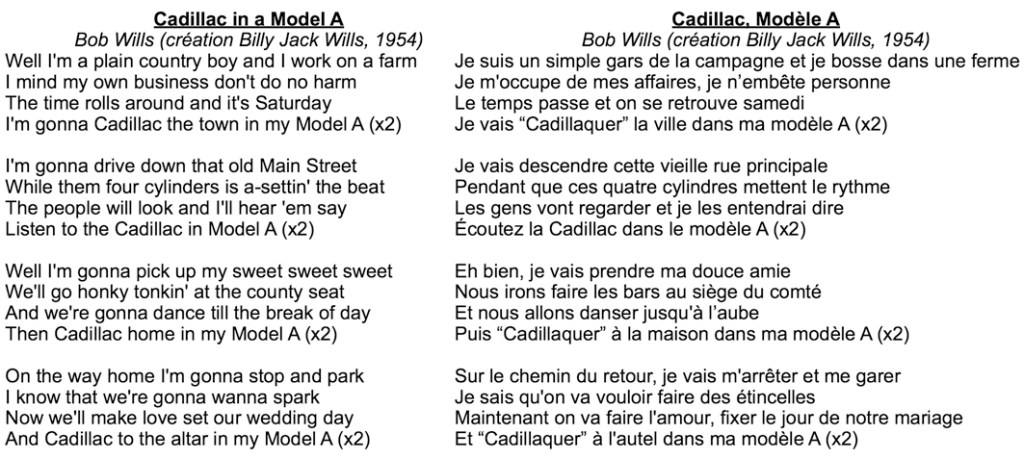 Il n’est pas envisageable de lister l’intégralité des chansons focalisées sur une marque ou un modèle de voiture. Cependant, on pourra avec Mercury Blues mesurer à quel point la figure de style peut perdurer à travers les décennies et les genres.