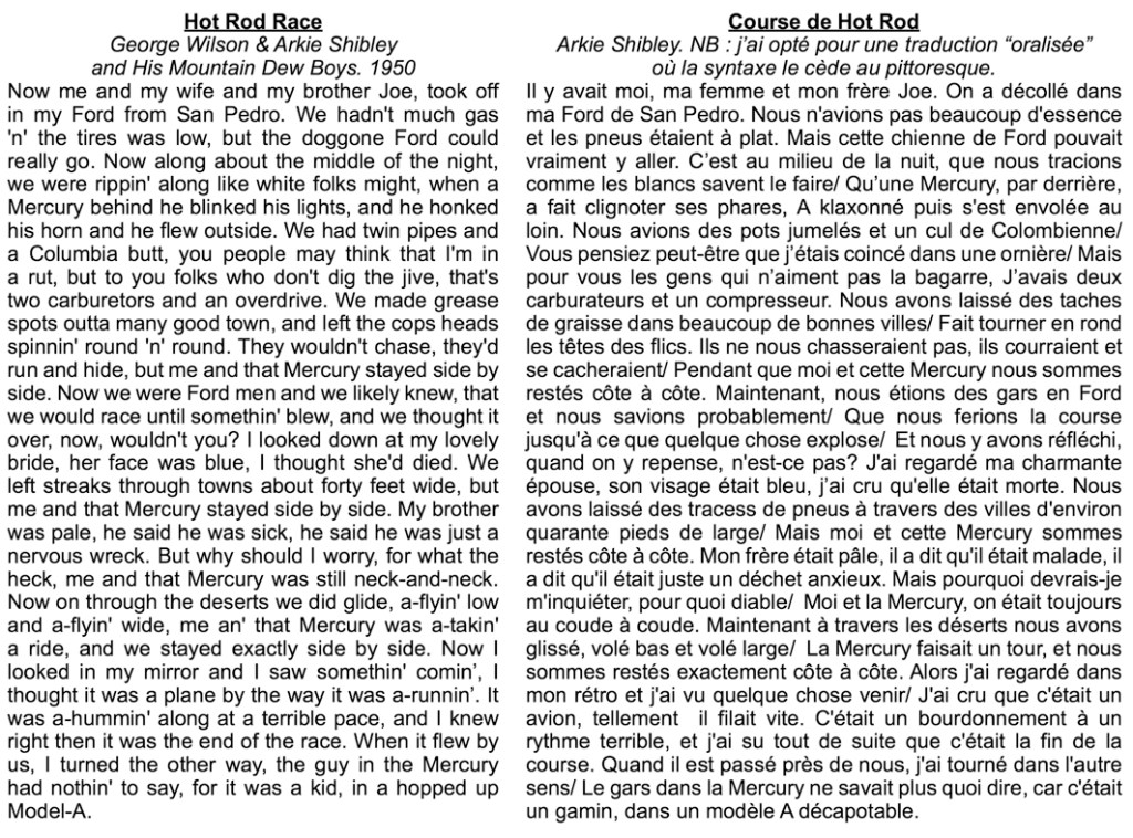 En 1950, Arkie Shibley (1914-1975) est le premier à exploiter le filon dans un format de “Blues parlé” que l’on trouvait surtout jusqu’alors dans le Western Swing sophistiqué de Tex Williams. Détails techniques, rivalité, course, le récit fait mouche auprès du public visé. Y compris avec un cliché raciste. A tel point qu’une flopée de réécritures et de séquelles va se développer sur le même thème jusque dans les années 60 ! D’abord cantonnée à la route, elle dérive vers les courses de bateaux à moteurs, et même à la rivalité spatiale soviéto-américaine avec l’étrange X-15 de Johnny Bond ! En 1955, Charlie Ryan donna une réponse à Arkie Shibley dans un format similaire, avec une belle intro de Hillbilly-Boogie, en adoptant sur la même course le point de vue d’un tiers !