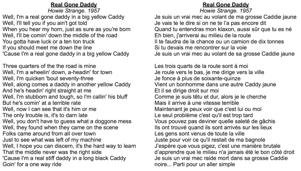 Si le Western Swing aborde la Cadillac dans le contexte de boom économique de l’après-guerre, inconcevable dans les années 30 saignées par la Crise, c’est dans le Rockabilly que l’on trouve peut-être ses premières et plus belles louanges. A savoir dans un style générationnel plus jeune, qui, contrairement à un stéréotype répandu, n’est pas qu’un cri de révolte adolescent. La vision rockabilly de la Cadillac est l’affirmation décomplexée d’un hédonisme “voiture de luxe puissante + filles subjuguées”. Poussée à son paroxysme, l’attitude vaniteuse du conducteur de Cadillac confine vite à l’arrogance d’un Howie Strange dans son Real Gone Daddy. Arrogance naturellement punie par une fin tragique.