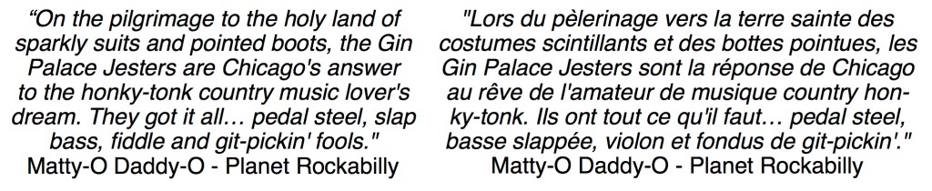 La première rend un hommage à la dinguerie kistch de Web Pierce et à sa fameuse Pontiac à cornes de vache. Les Gin Palace Jesters restituent la fascination encore réelle de nos contemporains (dont fait partie l’auteur de ces lignes) pour toute la prolifération baroque visuelle qui saisit les vêtements des interprètes, leurs instruments, et leurs voitures à partir des années 50.
