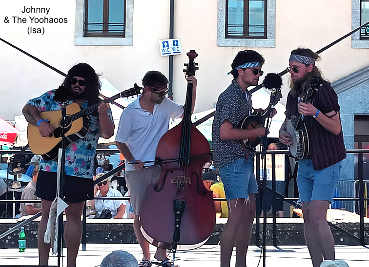 Je suis heureusement arrivé à temps pour le concert de The FOUNTAINEERS (qui a quand même démarré avec deux heures de retard). C’est un groupe établi en Ecosse mais le banjoïste Rob Hart est de Caroline du Nord, la violoniste Jeri Foreman australienne et le mandoliniste Callum Morton-Teng a suivi le cursus bluegrass de l’Université ETSU dans le Tennessee. Le groupe est né de jam sessions en extérieur durant le premier confinement. Un groupe tout récent donc et il faut féliciter Christopher d’avoir osé faire passer une formation avec si peu de références sur la grande scène. Sa confiance a été récompensée par un concert varié, allant de Lester Flatt (Gonna Settle Down) à des reprises de titres assez récents (Train On The Island de Tim O’Brien, In The Gravelyard de Blue Highway et une chanson de Breaking Grass), en passant par les Country Gentlemen (Leaves That Are Green), un poème mis en musique par Joe K. Walsh (Innisfree), quelques compositions et des instrumentaux (le classique Goodbye Liza Jane, un fiddle tune de John Hartford, de la Dawg music). Je les ai trouvés meilleurs sur les titres plus modernes qui me semblent mieux convenir à la voix du guitariste Michael Wright. J’ai beaucoup apprécié les solos en finesse de Callum Morton-Teng, bizarrement affublé d’une combinaison style pompiste qui ne semblait pas convenir à la température de ce mois d’août. Jeri Foreman a un jeu très énergique. Rob Hart est plus discret mais ses roulements en back up sont essentiels pour le son du groupe.