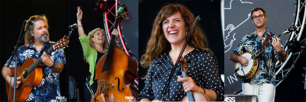 Depuis que j’ai entendu leur album Alegria, associant bluegrass et flamenco, j’avais hâte de découvrir le groupe FLAMENGRASS sur scène. Je n’ai pas été déçu car en plus de jouer les titres de l’album, Carol Duran (fdl) et Lluis Gomez (bjo) font le show. Ce n’est pas la première fois que Lluis joue à La Roche et on connaît son humour et son talent. Carol a tout, le charme, l’énergie. Elle est Espagnole (Catalane si elle préfère) jusqu’au bout des ongles. Ses mains dansent quand elle chante. Parfois, elle danse tout court et fait danser les autres musiciens. Elle chante magnifiquement Quan S’Atura El Temps et Station In Your Heart. Je me suis aperçu que c’était Maribel Rivera (cbss) qui chantait -très bien- Nel Pozu. Les harmonies vocales des deux chanteuses sont aussi jolies que sur l’album. En concert, on perçoit mieux que sur disque le talent du guitariste Javier Vaquero qui a un rôle rythmique essentiel mais prend aussi de nombreux solos. J’ai des petits camarades qui ont trouvé que le banjo ne s’intégrait pas bien à l’ensemble. Il y a des passages en single string qu’on peut juger un peu heurtés mais dans l’ensemble, le jeu de Lluis était d’une grande fluidité. Je l’ai trouvé carrément impressionnant sur un instrumental dédié à la fois à Paco de Lucia et à Bill Monroe, enchaîné avec Used To Be (composition du père du bluegrass). La fin a été déjantée. Carol Duran a fait chanter tout et n’importe quoi au public surexcité. Flamengrass a terminé sur une chanson à la bonne humeur communicative et un dernier titre qui a une nouvelle fois permis à chaque musicien de se mettre en valeur. Yolé !