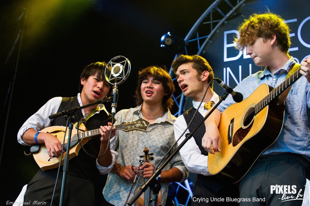 Les académies et cursus universitaires dédiés au bluegrass se multiplient depuis plusieurs années. CRYING UNCLE BLUEGRASS BAND est issu de l’un d’eux, basé en Californie et qui a de sacrées références puisqu’il a déjà vu passer Frank Solivan, Molly Tuttle et A.J. Lee (qu’on a tous pu déjà apprécier en vedettes à La Roche-sur-Foron – y aurait-il une filière?). Curieusement, dans le répertoire du groupe, il y a un fossé culturel entre les instrumentaux et les chansons. Concernant les premiers, Crying Uncle joue des reprises new acoustic (Ride The Wild Turkey de Darol Anger, 16 16 de Grisman) et des compositions newgrass et new acoustic. Pour ce qui est des chansons, ils tapent presque exclusivement dans les classiques (Little Willie, Katy Daley, Crazy Heart). Midnight Moonlight fait presque figure de choix audacieux alors que Peter Rowan l’a écrit il y a près d’un demi-siècle. Ils chantent aussi deux titres country, tout aussi datés (Buck Owens et George Jones). Miles Quale (fdl), Teo Quale (mdo) qui ont suivi les cours de Mike Marshall et Darol Anger, John Gooding (gtr) et Andrew Osborn (bss) sont d’excellents musiciens et leur performance a été réellement impressionnante sur les instrumentaux. Par contre, leurs voix sont encore juvéniles (ils ont entre 17 et 21 ans), particulièrement celles de Miles et Teo. Andrew s’en sort mieux, notamment dans Old Man de Neil Young qu’ils ont interprété en rappel avec des parties improvisées qui ont enthousiasmé le public. Crying Uncle a été la révélation de cette édition 2022 pour Alain Kempf ! Il les avait déjà vus la veille sur la petite scène du midi et ils avaient joué un set différent -ce qui n’est pas un mince exploit pour de jeunes musiciens- dont une version du standard All Of Me qui témoigne encore de leur intérêt pour le jazz.