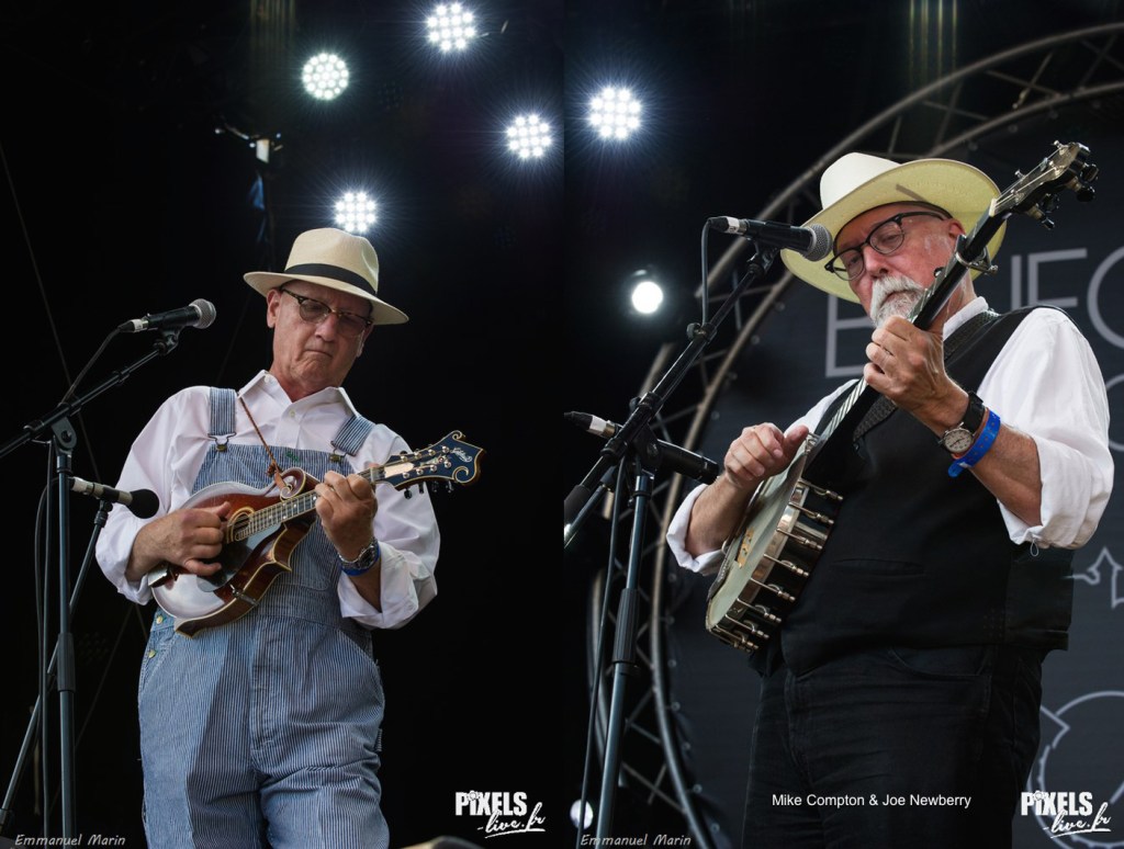 Je suis arrivé devant la grande scène du festival pour le concert de COMPTON & NEWBERRY. Tous les amateurs de bluegrass connaissent le mandoliniste Mike Compton, un des meilleurs spécialistes du style de Bill Monroe. Il a été membre de Nashville Bluegrass Band et du groupe de John Hartford. Il affectionne aussi les performances en duo (avec David Grier ou Norman Blake notamment). Son partenaire depuis quelques années est le banjoïste et guitariste Joe Newberry. Physiquement, ce dernier est le portrait craché du Colonel Sanders (Kentucky Fried Chicken – c’est pas un groupe bluegrass, c’est du poulet). Au banjo, il joue essentiellement en style clawhammer. Ils chantent tous les deux. Pas mal de classiques à leur répertoire comme Fly Around My Pretty Little Miss, Florida Blues, Raleigh & Spencer ou Kentucky Waltz de Bill Monroe (très bien chanté), mais aussi des titres moins connus et des compositions. Ça swingue sur Honky Tonk Swing (encore Bill Monroe) et Alabama Baby. Il y a eu des mandolinistes impressionnants dans ce festival, notamment Tristan Scroggins et Teo Quale qui jouent vraiment très vite certains passages. L’art de Mike Compton est ailleurs. Chaque note sonne incroyablement distincte, même quand ça va vite. Il allie énergie et précision. La beauté est aussi dans les détails avec ces petites notes tirées pour souligner les finales blues dans I Know Those Tears, composition de Joe Newberry dédiée à sa mère et très bien chantée. Compton joue aussi Jenny Lynn en accordage ouvert (AEAE), un instrumental mentionné par Bill Monroe dans Uncle Pen :
