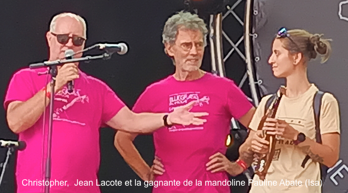 J’ai fait un tour à l’ombre dans le bâtiment réservé aux luthiers pour admirer leur travail et voir de près la mandoline de voyage (démontable, jouable par les gauchers comme les droitiers) offerte par Jean Lacote au festival (la mando est en vente aux enchères et l’intégralité de la vente ira dans les caisses du festival). Un très bel objet, astucieux, avec un joli son (il faut des écouteurs). Jean m’a aussi montré sa dernière création, une mandole blonde en érable ondé (si je me souviens bien). Magnifique et en plus, Jean en parle très bien.