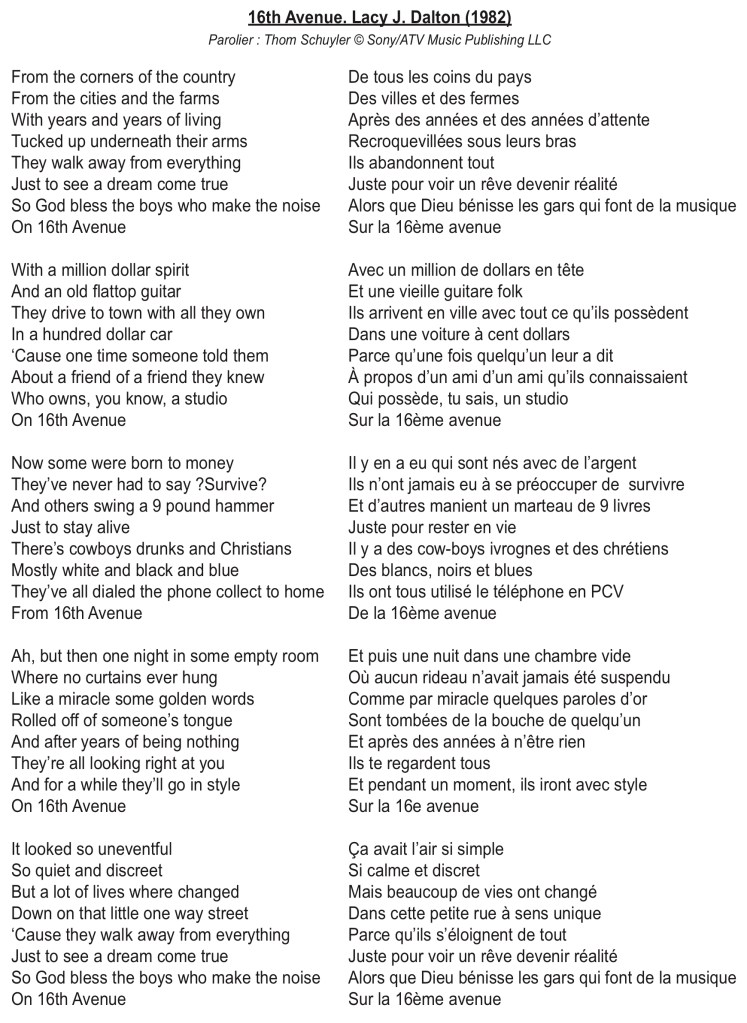 « Seizième Avenue » : Enregistrée par Lacy J. Dalton et sortie en septembre 1982 en tant que deuxième single et titre de l’album (16th Avenue). C’est Billy Sherill, producteur controversé responsable de la dérive pop de la Country des années 70-80, qui força la main de l’auteur Tom Schuyler pour qu’elle soit enregistrée. Ici pas de dénonciation d’un système corrompu, mais un mélo tartiné dans le pathos avec des relents christiques : de nombreux appelés mais peu d’élus sur la voie tortueuse et doloriste du salut. Les vaches sont bien gardées. Le ton est complaisant. Et Music Row à Nashville, dans les années 1960, passa de quartier résidentiel à boulevard de bureaux rénovés pour l’industrie de la musique.
