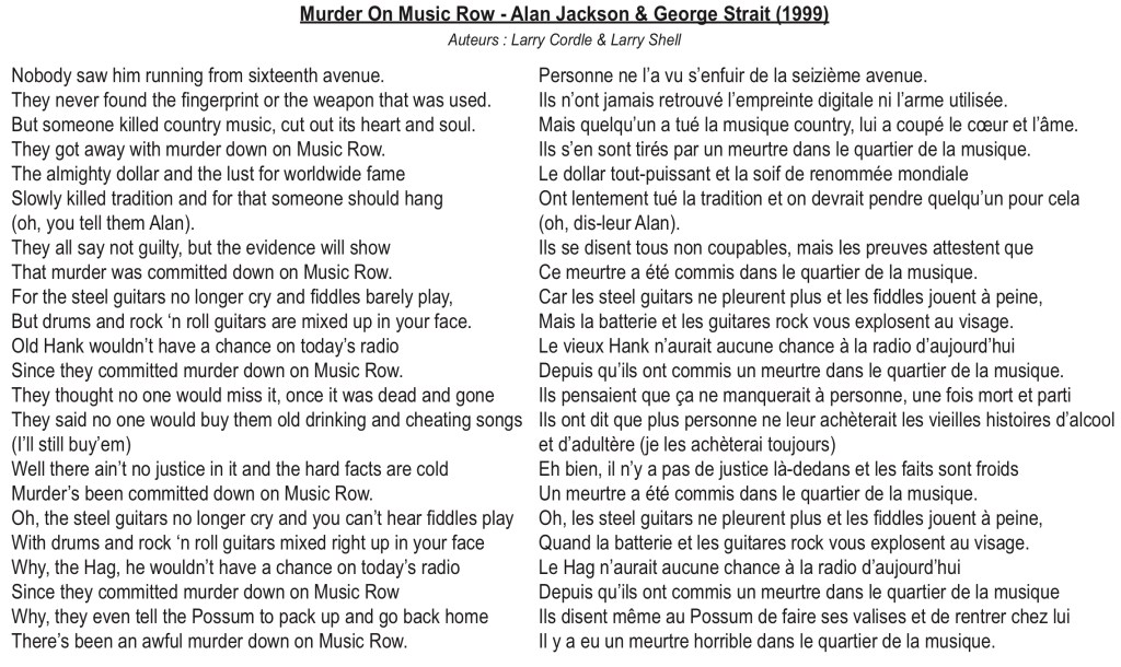 Une fois de plus, la force de la Country music réside dans sa capacité à simultanément suivre des dynamiques centrifuges, lui faisant courir le risque de sa disparition comme entité solide, tout en produisant en son sein un discours critique sur ses dérives.