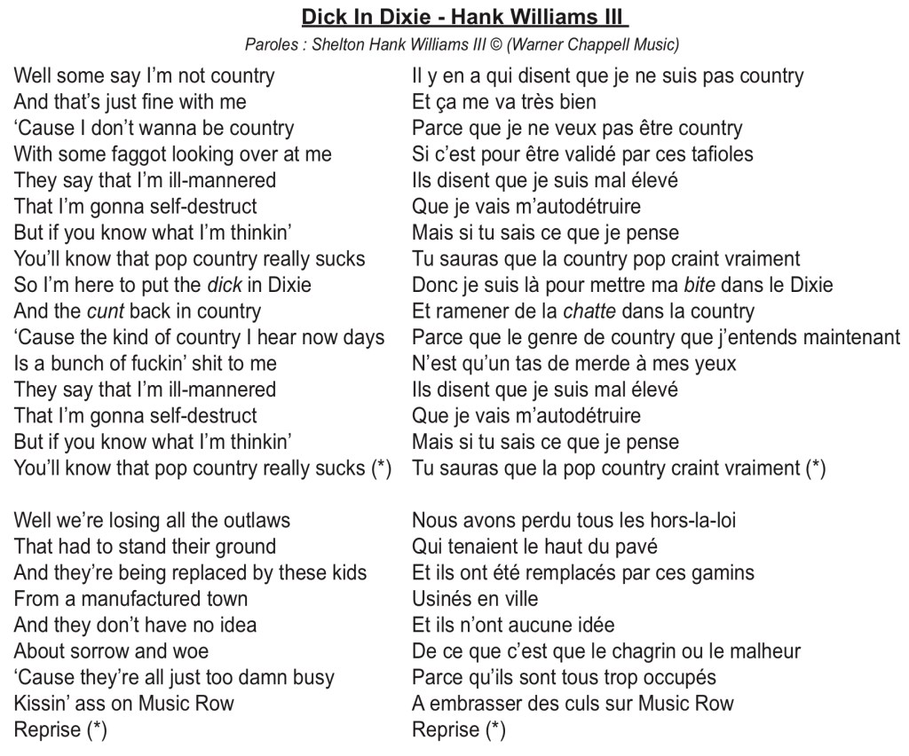 Il use et abuse de son image de rebelle redneck avec une violence dont le politiquement correct inclusif et bienveillant de la soupe nashvillienne mainstream ne pouvait pas décemment se remettre. Paradoxal est le point de vue d’où s’exprime III : il adule les formes classiques, Bluegrass, Honkytonk dont il ne cesse de révérer les figures dans ce même album, pour mieux pourfendre le Nashpop, la pire perversion à ses yeux, une condamnation que je partage dans le fond si ce n’est la forme :