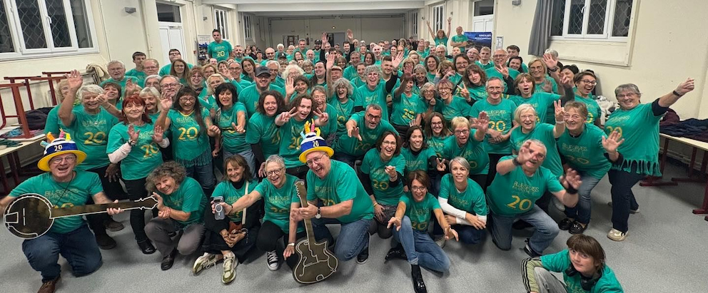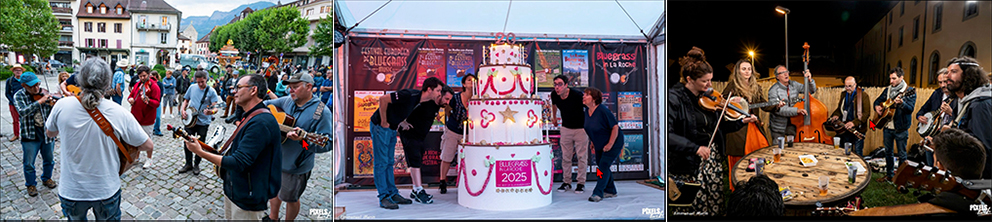 Tous les groupes présents sur scène l’ont d’ailleurs saluée et ont remercié Christopher et Philippe de les avoir fait venir à La Roche cette année. Beaucoup se sentent chez eux à Bluegrass in La Roche. La grande innovation de 2025 était que les concerts étaient filmés sur grand écran grâce à l’équipe de Fred Glas et Christophe Flament. La réalisation s’est efforcée de montrer en gros plan les solistes, ce qui n’est pas toujours évident pour un concert bluegrass. La cerise sur le gâteau a été… un gâteau ! Le premier soir, un gâteau d’anniversaire géant (offert par le Conseil Départemental de Haute-Savoie) a été partagé entre les spectateurs pour fêter la vingtième édition. Nous étions nombreux mais, avec 3000 choux, il y en a eu pour tout le monde ! © Dominique Fosse