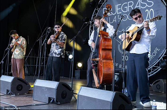 Les Anglais de The Often Herd avaient remporté le concours de groupes en 2018 et, à ce titre, ils avaient rejoué sur la grande scène en 2019. C’est cependant la première fois en 2025 qu’ils se présentaient au grand complet à Bluegrass in La Roche puisque leur violoniste Niles Krieger était absent lors de leurs prestations précédentes (il avait été remplacé par le Français Marius Pibarot en 2018 et par un fiddler anglais en 2019). En vérité, les quatre musiciens actuels de Often Herd s’étaient déjà produits ensemble à La Roche lors du concours de 2016 mais c’était sous le nom de The Kentucky Cow Tippers et il leur manquait leur banjoïste, ce qui leur avait peut-être coûté la première place du concours. Par la suite, ils avaient décidé de changer de nom et de se passer de banjo. Ce qui leur va très bien. Dès la première chanson, interprétée d’une voix douce par le mandoliniste Evan Davies, on se rend compte que Niles Krieger est un fiddler tout simplement fantastique. Evan a chanté deux autres de ses compositions, Remember My Name et Hold On à propos du Brexit (il est contre -ne serait-ce que pour venir plus facilement à La Roche-sur-Foron). Sa voix contraste avec celle, plus énergique, du guitariste Rupert Hugues, plus rock’n’ roll avec ses lunettes style Top Gun et son sourire qui éclaire les montagnes situées face à la scène, pourtant distantes de quelques kilomètres. Rupert est un chanteur énergique et charismatique. Il interprète très bien Casablanca, une chanson relevée par un riff rythmique et Cool Summer Rain -carrément pop. Niles Krieger chante dans un registre de baryton Why You Been Gone So Long de Mickey Newberry. Très beau trio avec Evan et Rupert sur le refrain. Les harmonies vocales sont un des (nombreux) points forts du groupe. Ce sont aussi d’excellents musiciens. Evan est un mandoliniste inventif. Sur le troisième titre, Sycamore Gap, un instrumental composé par Niles, ce dernier a cassé une corde. Il a joué presque tout le set avec le fiddle de Raphaël Maillet, jusqu’au final éblouissant sur le traditionnel Sail Away, très bien arrangé tant vocalement que musicalement, avec un refrain particulièrement accrocheur. The Often Herd, champions d’Europe du bluegrass (ex aequo avec Red Wine, du coup).