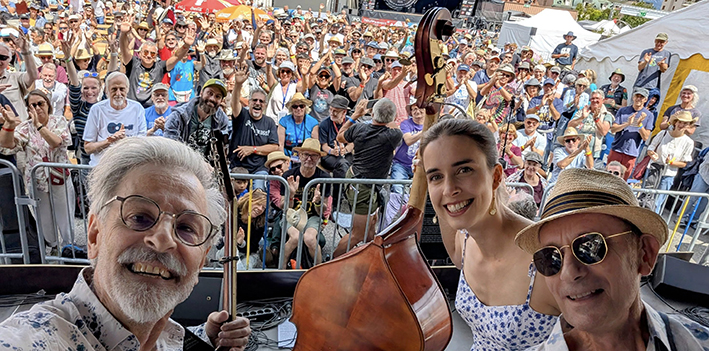 Les habitués de La Roche-sur-Foron étaient tout heureux de retrouver Le Chat Mort, un des groupes chouchous du festival. La formation suédoise n’était pas venue depuis 2018, année où elle avait été invitée en tant que vainqueur (ex aequo) du concours de la précédente édition. Camilla, la chanteuse qui joue de la caisse claire, est toujours aussi jolie mais elle n’a décidément pas la bonne couleur de peau. Sa voix m’a semblé encore plus rauque et cassée que par le passé. Elle convient à merveille à ce mélange de swing, de blues, de bluegrass et de musique de la Nouvelle Orléans. Le répertoire a peu évolué (les dix titres de Malla Walla Dalla, leur dernier album paru en 2021, figuraient tous sur le CD La Roche Edition que Le Chat Mort proposait lors du festival de 2018). Je pense que Le Chat Mort ne s’est pas beaucoup produit ces dernières années et j’ai d’ailleurs trouvé Bror David Neideman (bjo) et Peter Strömquist (gtr) moins brillants solistes que par le passé. Leur jeu privilégie de plus en plus les solos en accords au détriment du picking bluegrass. Au fur et à mesure des années, les chansons bluegrass composent d’ailleurs une part de plus en plus congrue de leur répertoire. Ils y sont quand même revenus à la fin du set avec le classique Old Time Religion (avec Raphaël Maillet au violon), Blue Moon of Kentucky (chanté par deux jeunes filles, Luna et Mila) et, en rappel, Prairie Wind, obscure (mais jolie) chanson qui a donné le goût du bluegrass à Bror David. Avec Foggy Mountain Top joué en début de set, ces titres ont équilibré le reste du répertoire essentiellement swing (dont beaucoup de très bonnes compos de Bror David) avec les toujours formidables Shoot Me Down, Dinah, Roses, Iko Iko et Bloodshot Eyes en final. De belles retrouvailles avec le public rochois que la seule averse du festival (le temps de cinq ou six chansons) n’a pas réussi à gâcher.