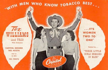 Tex Williams est un des meilleurs crooners du Western swing tardif des années 40-50. Star consacrée du Big band de Spade Cooley comme vocaliste, il fréquenta de près ce dernier, alors modèle de psychopathe violent, jaloux et suspicieux, une sorte de diamant noir. Nous ne saurions mieux conseiller à nos lecteurs anglophones que d’écouter le blog magistral de Tyler Mahan Coe “Cocaïne and Rhinestone” consacré à Spade où il détaille avec des précisions cliniques les tortures qu’il fit subir à son épouse avant de l’assassiner sous les yeux de leur gamine. Tex n’avait pas ce profil, mais, avant sa séparation violente avec Spade Cooley en 1947 il baignait à Hollywood dans un climat délétère de toxicomanie, de prostitution, de perversions diverses qui alimentèrent les romans de James Ellroy. Frustrations, jalousies et réussites météoritiques, un terreau favorable à l’expression d’un mépris bien navrant et assez consensuel pour l’époque. Tex en est conscient, tout le procédé relève d’une connivence entre mâles, tout à fait conscients que ça ne passera pas : “Dis ça à une femme et elle te remettra à ta place/ Dis ça à une femme et elle te giflera.”