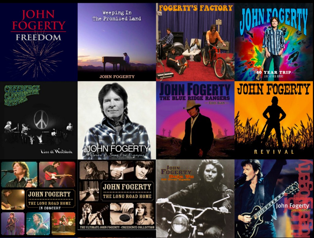 JOHN FOGERTY SOLO En 1973, John Fogerty commença sa carrière en solo avec un diamant longtemps mal compris en Europe, The Blue Ridge Rangers. La couverture le montre avec d’autres musiciens en silhouette au sommet d’une colline que l’on suppose se trouver dans les Caroline, sous un ciel d’un bleu céruléen. C’est un virage bluegrass et country fabuleux avec Donald Duck Dunn à la basse et Eddie Bayers à la batterie. John joue tous les instruments, acoustique, électrique, mandoline et dobro sur des standards tels que Jambalaya de Hank Williams, Hearts Of Stone des Charms, ou le Blue Yodel n°4 de Jimmie Rodgers . Il suivit ensuite avec John Fogerty en 1975 et le hit Rockin’All Over The World.