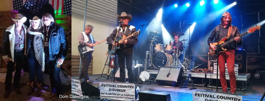 Deux groupes se partagent la scène ce samedi 5 novembre. Dom Daleegaw, impressionnant phénomène vocal dont le timbre l’a fait surnommer “le Dwight Yoakam français” a eu l’honneur d’ouvrir en deux set. Le premier assez diversifié comprend des compositions, des reprises (y compris de Prince !) countryfiées dans une coloration Bakersfield autour d’une formation réduite (Basse-Batterie-Telecaster). J’ai apprécié en particulier I Sang Dixie et même si le public de line dancers qui constituait la majorité des effectifs recherche avant tout du tempo moyen ou rapide, c’est sur les ballades que l’artiste se révèle le plus impressionnant et original. L’ensemble est plus que convainquant : pas de gras, mise en place au cordeau, niveau instrumental professionnel. Je rêve qu’une pedal steel et un fiddle puissent enrichir l’ornementation. Ce dernier étant d’ailleurs en cours d’intégration.