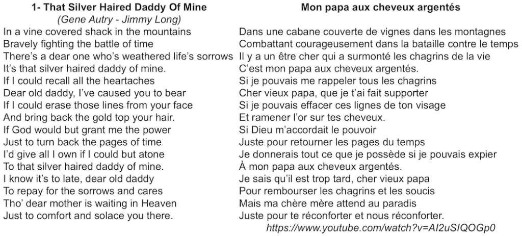 Musique du peuple, pour et par le peuple, la famille y tient une place centrale, réaliste et pas nécessairement idéalisée. Dans ce contexte, où les générations vivent souvent ensemble dans le même foyer, le vieux est un membre à part entière de la communauté. Considéré avec tendresse et sollicitude. Il est le gardien des valeurs familiales. En 1935, Gene Autry réussit à vendre plus d’un million de disques avec ce titre :