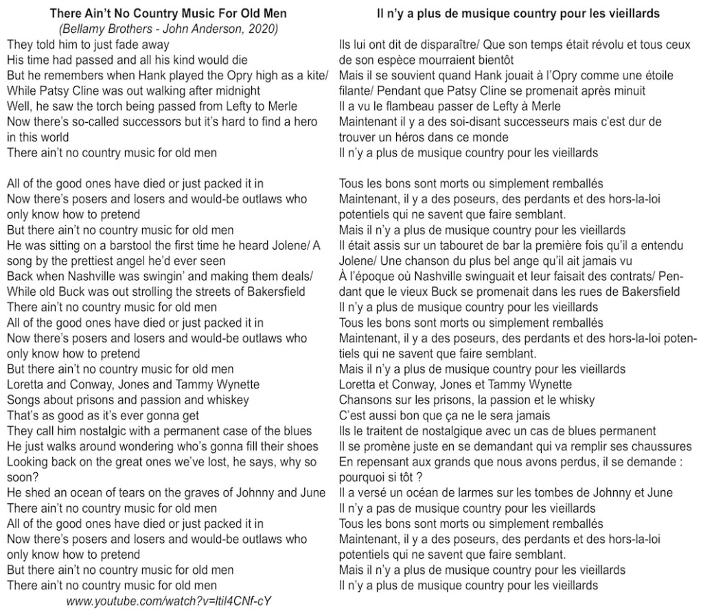 A l’heure où nous rédigeons ces lignes (octobre 2023), l’or gris est pris en compte par le business et l’on a assisté à un rééquilibrage. Les divers mouvements revivalistes et les processus de validation culturelle ont légitimé le maintien, voire le développement du culte des ancêtres. Loin d’être un handicap sclérosant, le phénomène est désormais revendiqué. Il n’en reste pas moins que la nostalgie est toujours présente et que le consensus ne sera jamais universellement établi. Il est amusant de constater que la chanson choisie pour conclure cet article, en dépit de son amour proclamé pour la tradition et le dénigrement des jeunes, est le fait de deux hommes qui dans les années 70 incarnaient la fusion du Nashville sound avec le pop-folk et le disco californien bien loin des artistes de légende mentionnés.