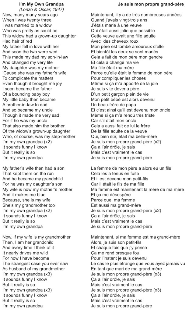 Une fois encore la réalité est beaucoup plus complexe. Signée par Dwight Latham et Moe Jaffe, interprétée par Lonzo and Oscar en 1947, Je suis mon propre grand-père prend un malin plaisir à détruire par l’absurde le modèle. L’humour est aussi porteur d’un regard ironique sous-jacent sur les généalogies chaotiques souvent incestueuses prêtées aux hillbillies.