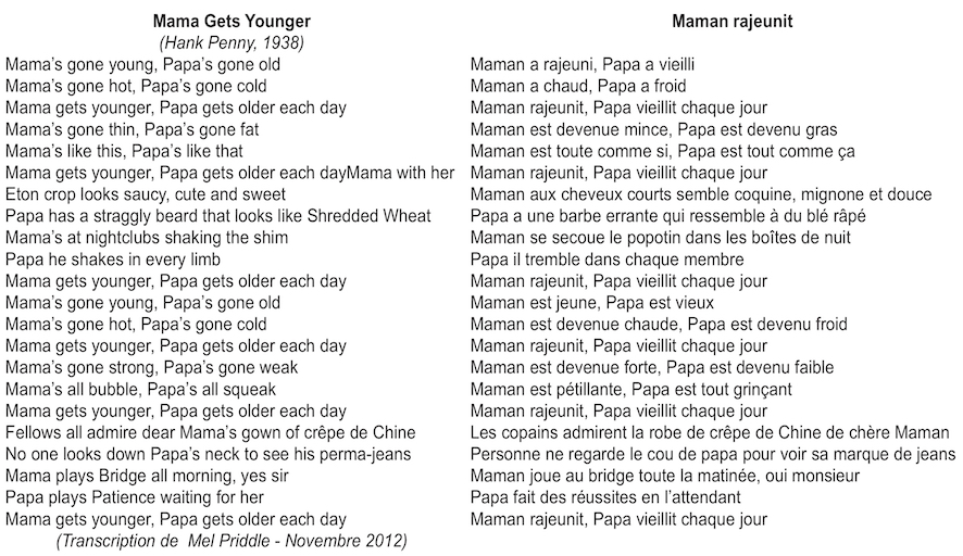 Aimer ses vieux n’empêche pas la satire, où, sur un ton grivois une moquerie sait pointer, et les métamorphoses inattendues que le grand âge sait provoquer. Hank Penny et ses Radio Cowboys reprennent en Western Swing une chanson de 1926 popularisée par le big band de Jack Hylton. Une version plus électrique de 1947 par Fairley Holden dans un style hillbilly-bop confirme l’intérêt du motif. On notera que la femme s’en tire mieux que l’homme, ce dernier étant réduit au stéréotype du hillbilly barbu en cottes, déjà d’un autre siècle.
