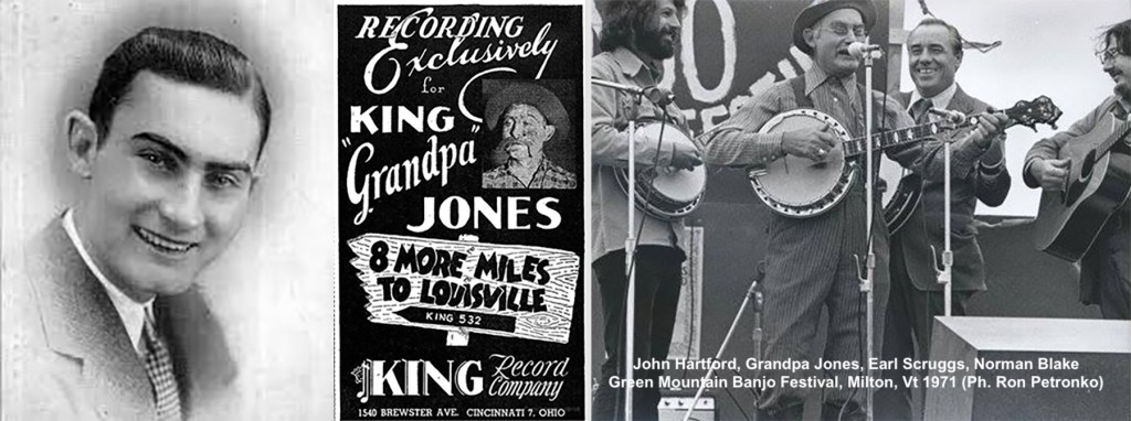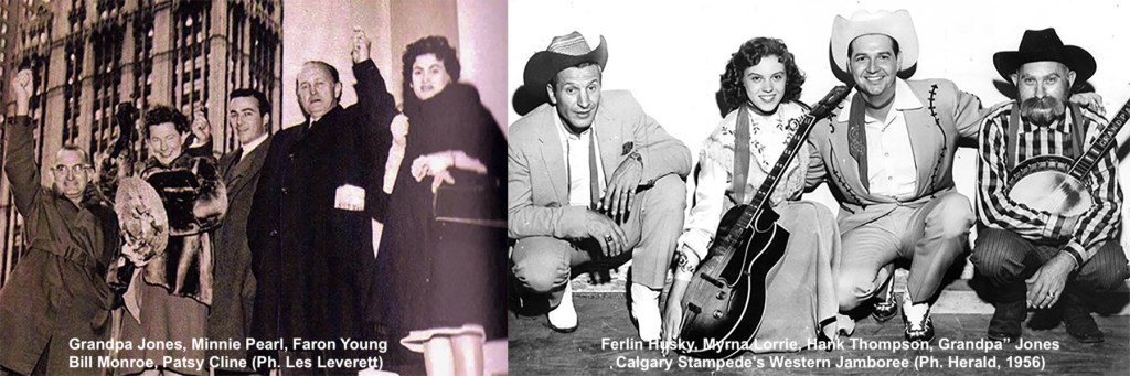 Certains même vont construire leur succès en devenant vieux avant l’âge On se doit de mentionner Grandpa Jones, (Louis Marshall Jones 1913-1998) chanteur et banjoïste clawhammer qui, dans sa première partie de carrière, fit partie des Brown Ferry Four et se fit connaitre par un répertoire ancré dans la modernité pas spécialement nostalgique : 8 More Miles to Louisville, Night Train to Memphis annonçant clairement le Rockabilly. A 22 ans, affligé par un physique que nous qualifierons de quelconque, il construit son image de grand-père rural avec des petites lunettes, une chemise à carreaux, des bretelles, des bottes et tout un jeu de scène faisant de ses performances un spectacle complet. Une image qu’il cultiva jusqu’à la fin de sa vie.